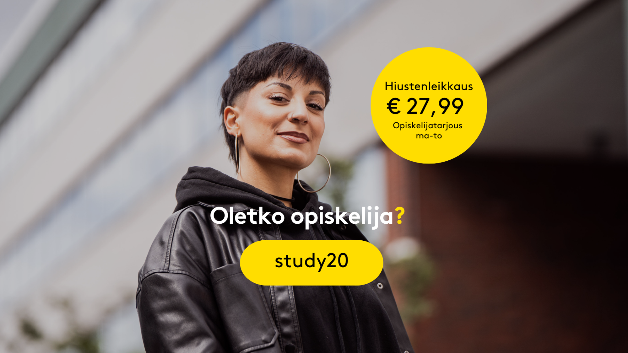 Hiustenleikkauksen normaalihinta on 34,99 €. Saat 20% alennusta leikkauksesta sovelluksessa. Koskee kaikkia opiskelijoita, joilla on voimassa oleva opiskelijakortti. Voimassa ma-to.